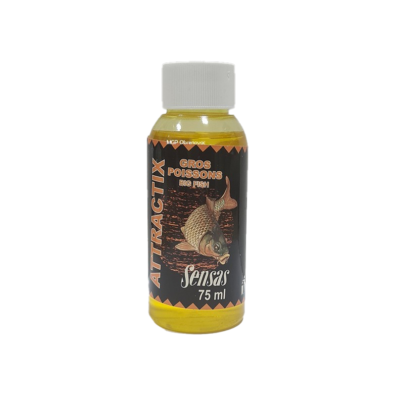 Sensas Attractix – Gros Poissons 75ml Ovo je koncentrovana tecnost koja ce brzo privuci krupniju ribu na hranilište.Njegova upotreba je skoro neograničena,pa se tako jednako uspešno pokazao kao „začin“praškastoj prihrani,spod i boili mixu. Dodati 1 supenu kasiku na 1kg hrane.